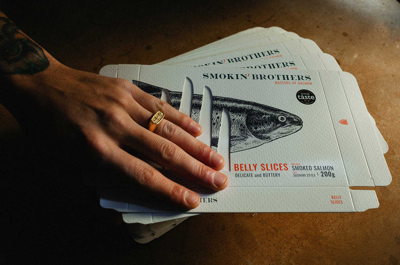 I nostri prodotti sono confezionati con materiali realmente sostenibili. Abbiamo investito molte risorse per scoprire materiali alternativi in linea con la filosofia di Smokin' Brothers. Tutte le nostre scatole sono realizzate in cartone monomateriale FSC e stampate con inchiostro a base d'acqua, rendendole completamente riciclabili così come sono! Abbiamo anche dato priorità ai materiali a diretto contatto con il nostro salmone affumicato. Abbiamo scelto vassoi completamente compostabili (cartoni FSC e vassoi in legno FSC) sigillati sottovuoto in buste di plastica riciclata. Ci impegniamo a esplorare e scoprire costantemente soluzioni innovative per alzare l'asticella con ogni lancio di prodotto.