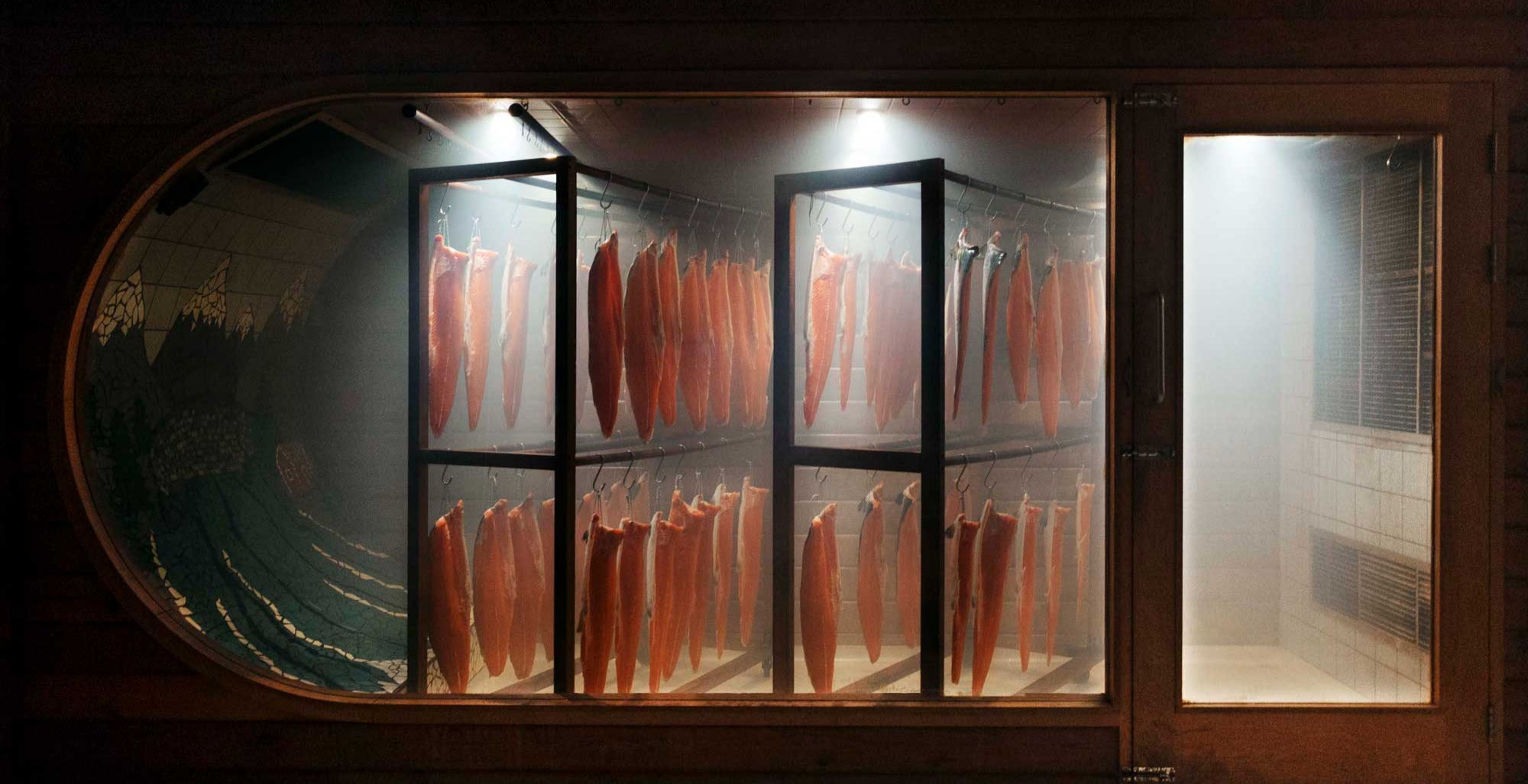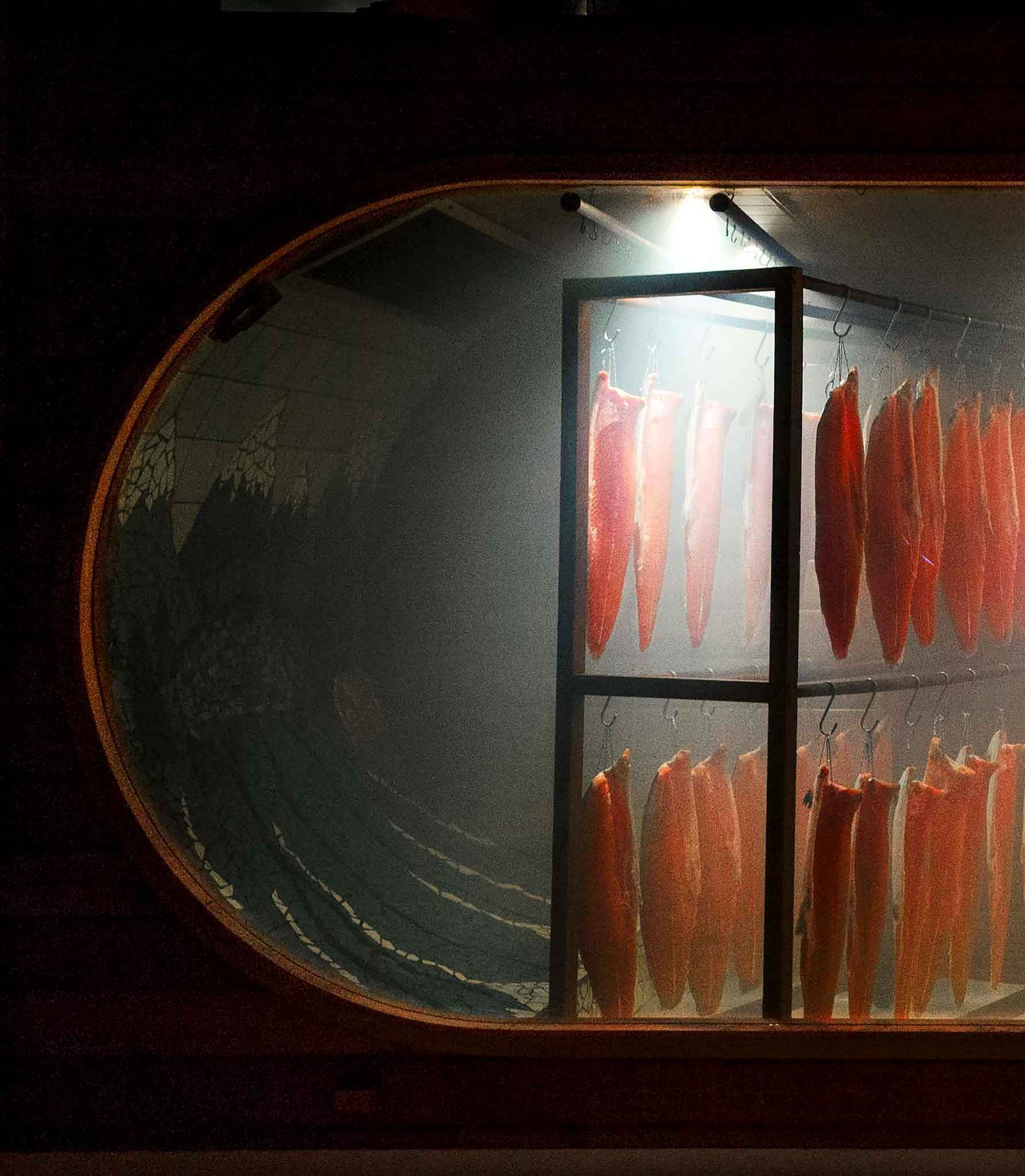 Lavorati in piccoli lotti per una perfezione epicurea, ogni baffa di salmone e trota vengono marinate esclusivamente con sale marino per almeno 10 ore. Questo delicato processo estrae l'umidità, asciugando alla perfezioen ogni pezzo preparandolo al processo di affumicatura.